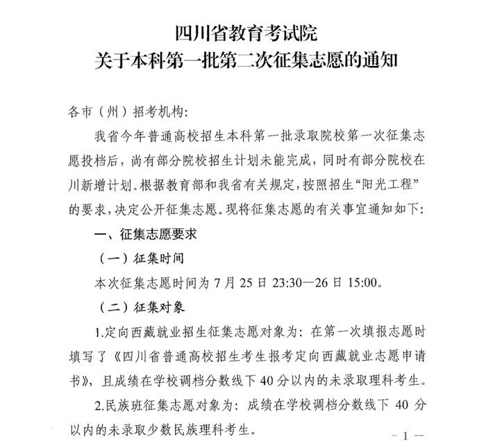 四川:关于本科第一批第二次征集志愿的通知