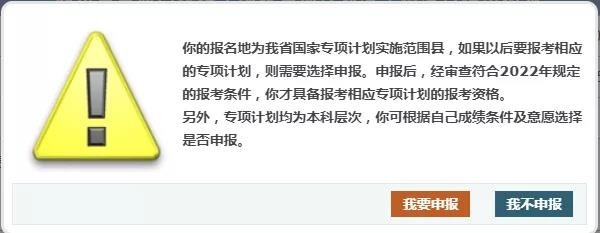 第9步:进入国家专项填报界面前会弹出如下图提示框。若符合申报条件且愿意申报的,点击“我要申报”;不符合申报条件的或符合申报条件但自愿放弃的,点击“我不申报”。如图: