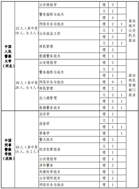 10.中国人民公安大学、中国人民警察大学、中国刑事警察学院、铁道警察学院、南京森林警察学院和福建警察学院公安类专业,限户籍在福建省范围内的考生报考。其中,福建警察学院公安类专业实行面向我省设区市(平潭综合实验区)生源定向招生,公安类专业招生计划按设区市(平潭综合实验区)分别编制,考生必须具有该设区市(平潭综合实验区)户籍,且在该设区市(平潭综合实验区)报名并参加高考。中国人民公安大学、中国人民警察大学、中国刑事警察学院、铁道警察学院、南京森林警察学院和福建警察学院公安类、司法警察类专业招生计划见附件1、附件2。