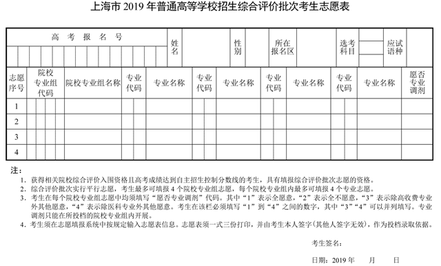 2.上海市2019年普通高等学校招生综合评价批次考生志愿表(样表)